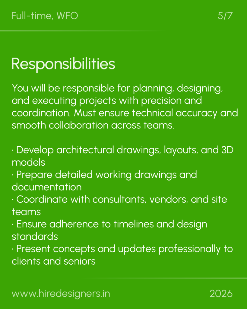 You will be responsible for planning, designing, and executing projects with precision and coordination. Must ensure technical accuracy and smooth collaboration across teams.