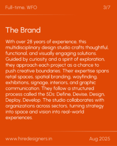 With over 28 years of experience, this multidisciplinary design studio crafts thoughtful, functional, and visually engaging solutions. Guided by curiosity and a spirit of exploration, they approach each project as a chance to push creative boundaries. Their expertise spans retail spaces, spatial branding, wayfinding, exhibitions, signage, interiors, and graphic communication. They follow a structured process called the 5Ds: Define, Devise, Design, Deploy, Develop. The studio collaborates with organizations across sectors, turning strategy into space and vision into real-world experiences.