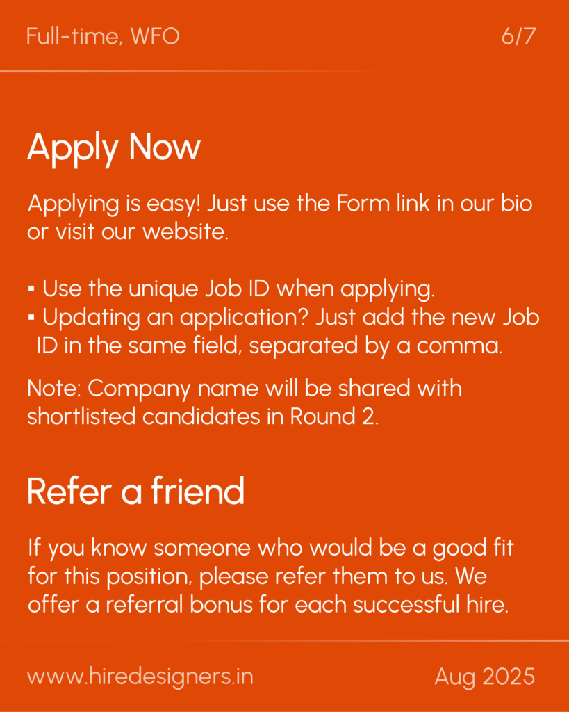 Creative thinker with a strong design foundation and a passion for visual storytelling. The ideal candidate should be fluent in digital and brand design, with the ability to turn ideas into compelling visuals..