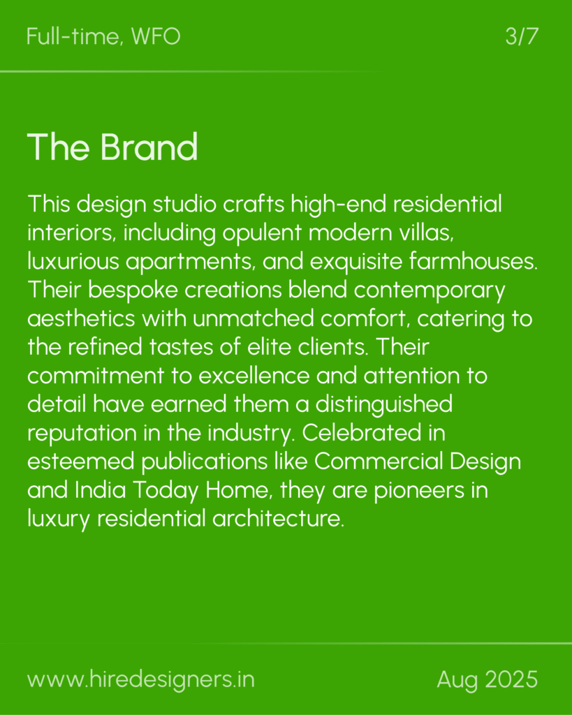 This design studio crafts high-end residential interiors, including opulent modern villas, luxurious apartments, and exquisite farmhouses. Their bespoke creations blend contemporary aesthetics with unmatched comfort, catering to the refined tastes of elite clients. Their commitment to excellence and attention to detail have earned them a distinguished reputation in the industry. Celebrated in esteemed publications like Commercial Design and India Today Home, they are pioneers in luxury residential architecture.