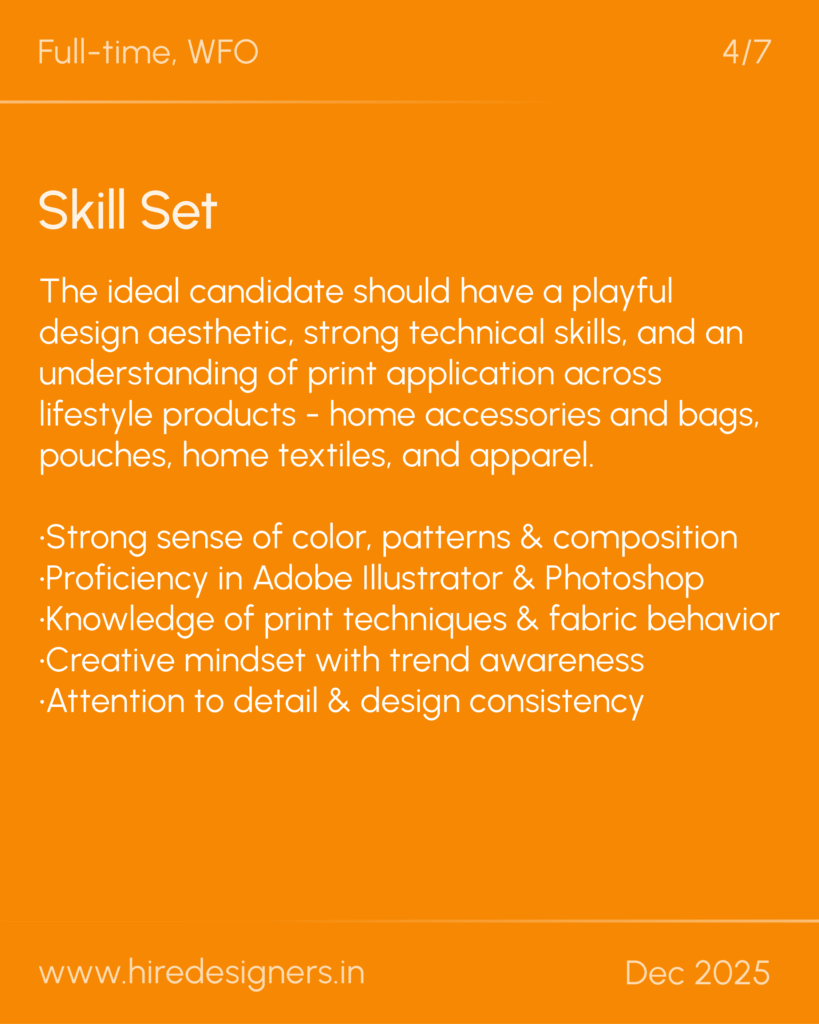The ideal candidate should have a playful design aesthetic, strong technical skills, and an understanding of print application across lifestyle products – home accessories and bags, pouches, home textiles, and apparel.