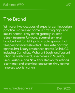 With over two decades of experience, this design practice is a trusted name in crafting high-end luxury homes. They blend globally sourced décor, bespoke furniture, curated art, and handcrafted furnishings to create spaces that feel personal and elevated. Their elite portfolio spans ultra-luxury residences across Delhi NCR, including Camellias, Maharani Bagh, and Vasant Vihar, as well as exclusive homes in Mumbai, Goa, Jodhpur, and New York. Known for refined aesthetics and seamless execution, they deliver timeless sophistication.