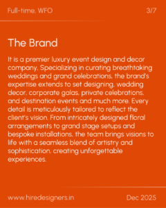 It is a premier luxury event design and decor company, Specializing in curating breathtaking weddings and grand celebrations, the brand’s expertise extends to set designing, wedding decor, corporate galas, private celebrations, and destination events and much more. Every detail is meticulously tailored to reflect the client’s vision. From intricately designed floral arrangements to grand stage setups and bespoke installations, the team brings visions to life with a seamless blend of artistry and sophistication, creating unforgettable experiences.