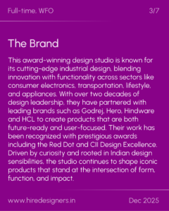 This award-winning design studio is known for its cutting-edge industrial design, blending innovation with functionality across sectors like consumer electronics, transportation, lifestyle, and appliances. With over two decades of design leadership, they have partnered with leading brands such as Godrej, Hero, Hindware and HCL to create products that are both future-ready and user-focused. Their work has been recognized with prestigious awards including the Red Dot and CII Design Excellence. Driven by curiosity and rooted in Indian design sensibilities, the studio continues to shape iconic products that stand at the intersection of form, function, and impact.