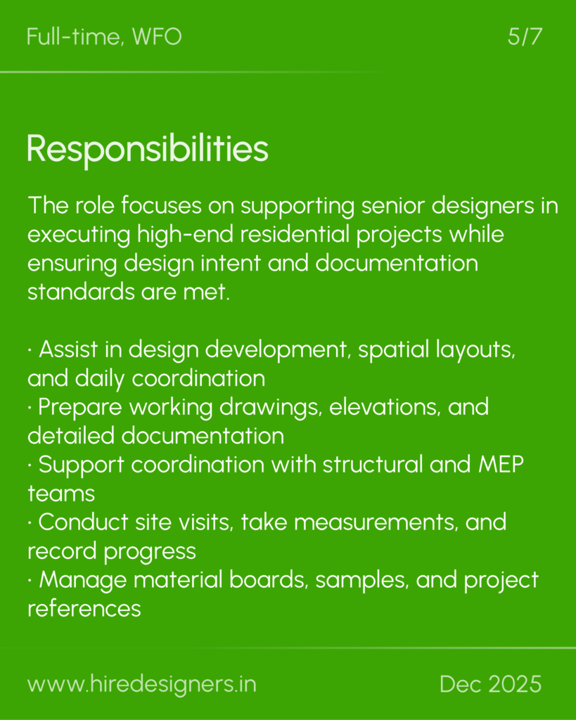 The role focuses on supporting senior designers in executing high-end residential projects while ensuring design intent and documentation standards are met.
