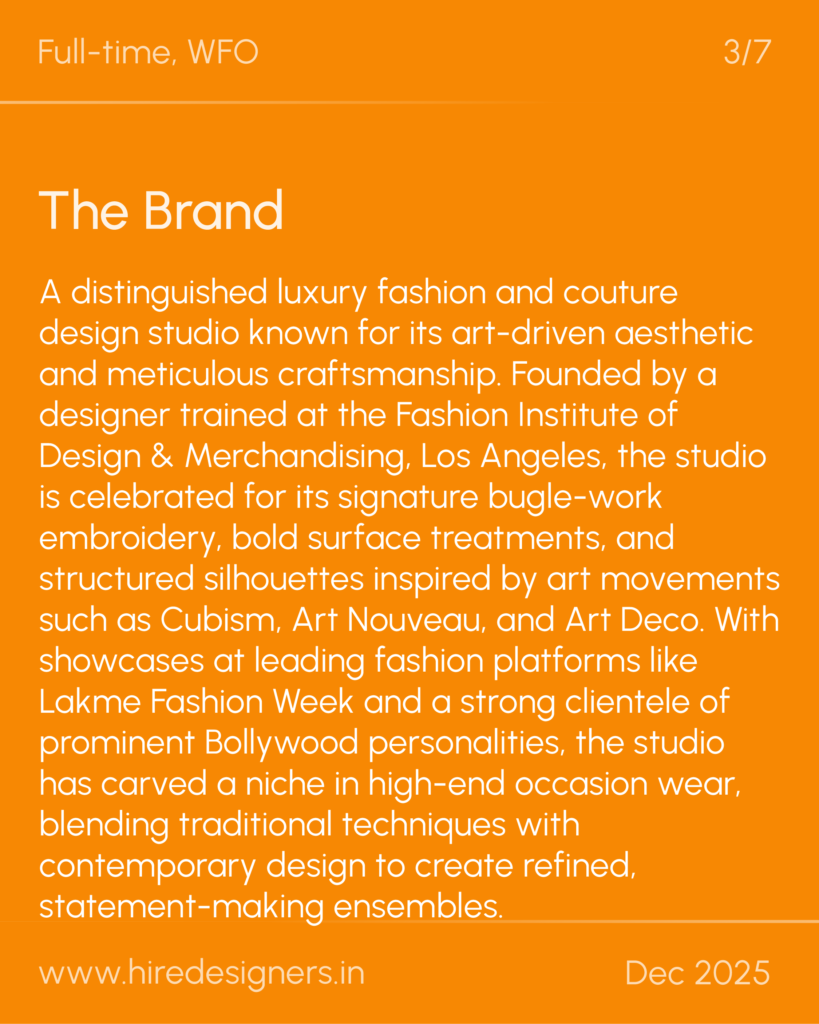 A distinguished luxury fashion and couture design studio known for its art-driven aesthetic and meticulous craftsmanship. Founded by a designer trained at the Fashion Institute of Design & Merchandising, Los Angeles, the studio is celebrated for its signature bugle-work embroidery, bold surface treatments, and structured silhouettes inspired by art movements such as Cubism, Art Nouveau, and Art Deco. With showcases at leading fashion platforms like Lakme Fashion Week and a strong clientele of prominent Bollywood personalities, the studio has carved a niche in high-end occasion wear, blending traditional techniques with contemporary design to create refined, statement-making ensembles.