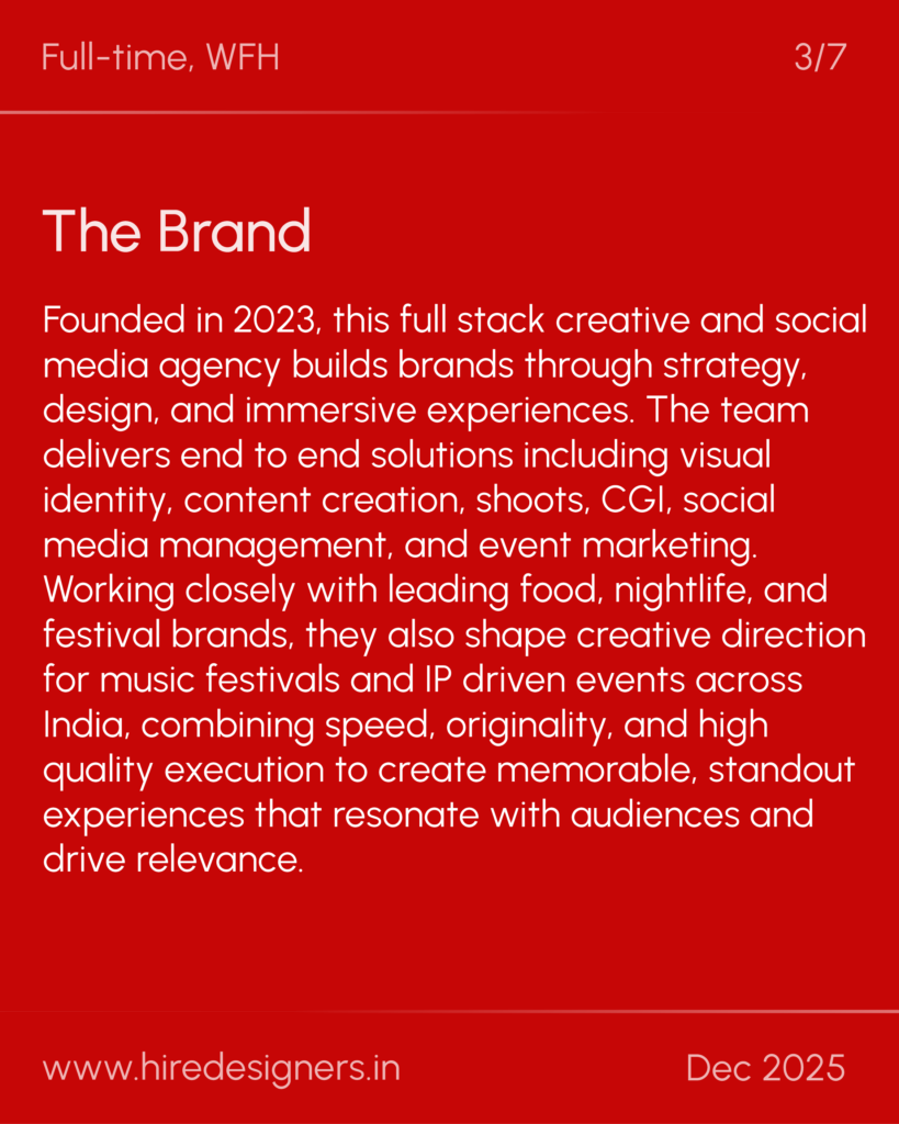 Founded in 2023, this full stack creative and social media agency builds brands through strategy, design, and immersive experiences. The team delivers end to end solutions including visual identity, content creation, shoots, CGI, social media management, and event marketing. Working closely with leading food, nightlife, and festival brands, they also shape creative direction for music festivals and IP driven events across India, combining speed, originality, and high quality execution to create memorable, standout experiences that resonate with audiences and drive relevance.