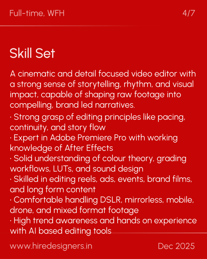 • Strong grasp of editing principles like pacing, continuity, and story flow
