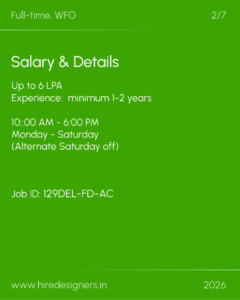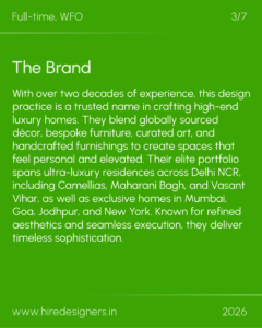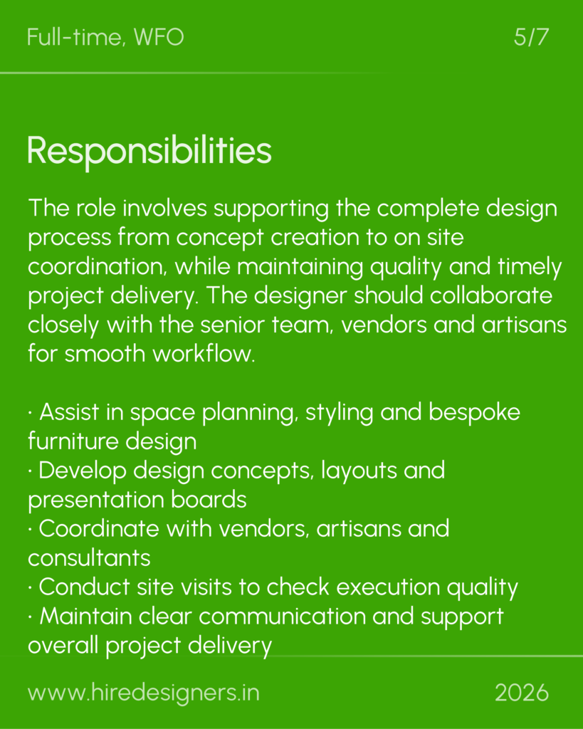 The role involves supporting the complete design process from concept creation to on site coordination, while maintaining quality and timely project delivery. The designer should collaborate closely with the senior team, vendors and artisans for smooth workflow.