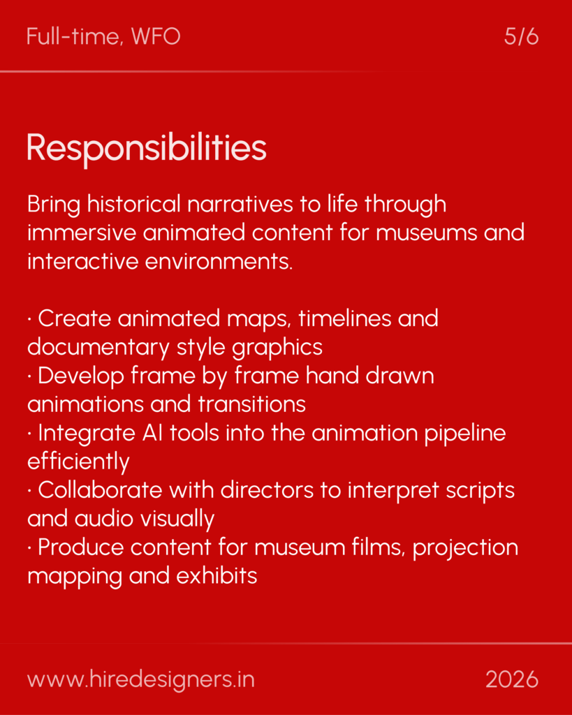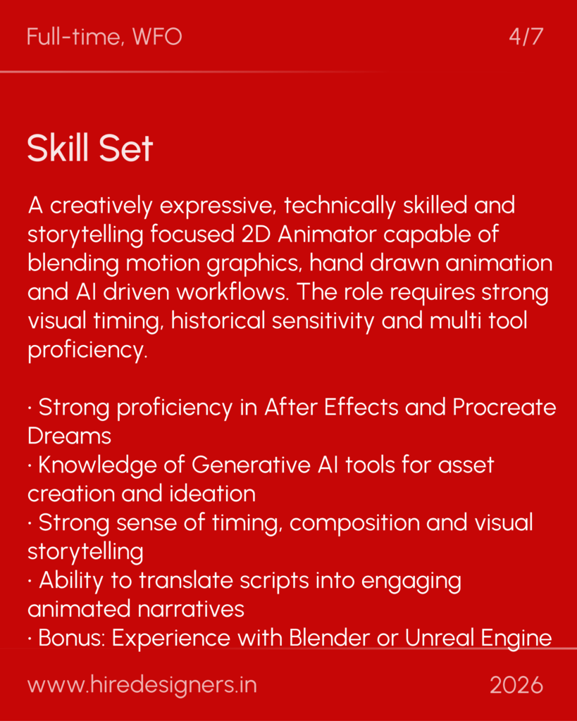 A creatively expressive, technically skilled and storytelling focused 2D Animator capable of blending motion graphics, hand drawn animation and AI driven workflows. The role requires strong visual timing, historical sensitivity and multi tool proficiency.