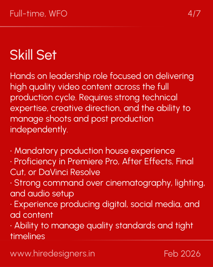 Hands on leadership role focused on delivering high quality video content across the full production cycle. Requires strong technical expertise, creative direction, and the ability to manage shoots and post production independently.