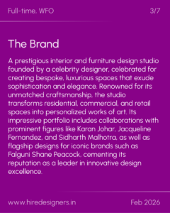 A prestigious interior and furniture design studio founded by a celebrity designer, celebrated for creating bespoke, luxurious spaces that exude sophistication and elegance. Renowned for its unmatched craftsmanship, the studio transforms residential, commercial, and retail spaces into personalized works of art. Its impressive portfolio includes collaborations with prominent figures like Karan Johar, Jacqueline Fernandez, and Sidharth Malhotra, as well as flagship designs for iconic brands such as Falguni Shane Peacock, cementing its reputation as a leader in innovative design excellence.