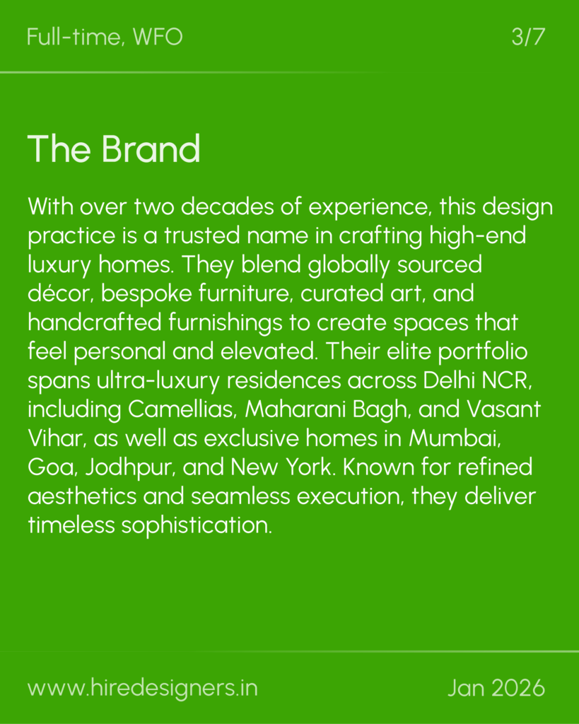 The role involves supporting the complete design process from concept creation to on site coordination, while maintaining quality and timely project delivery. The designer should collaborate closely with the senior team, vendors and artisans for smooth workflow.