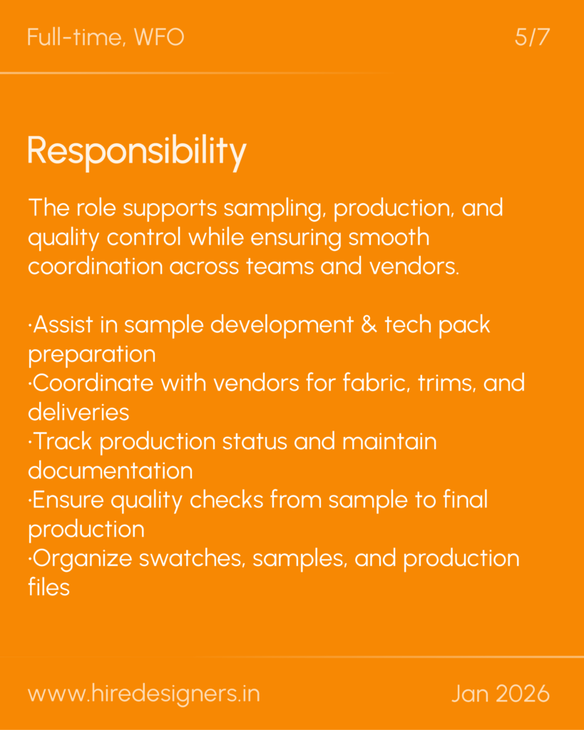 The role supports sampling, production, and quality control while ensuring smooth coordination across teams and vendors.