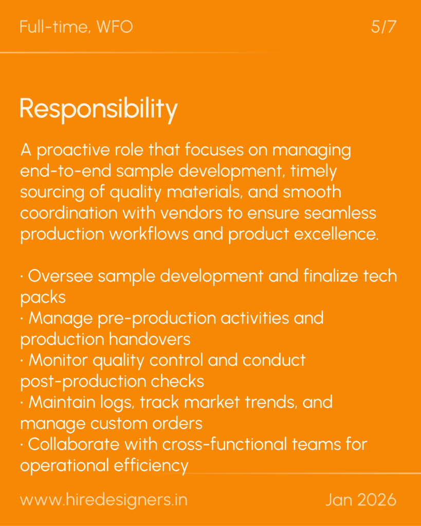 A proactive role that focuses on managing end-to-end sample development, timely sourcing of quality materials, and smooth coordination with vendors to ensure seamless production workflows and product excellence.