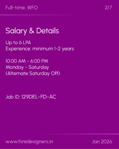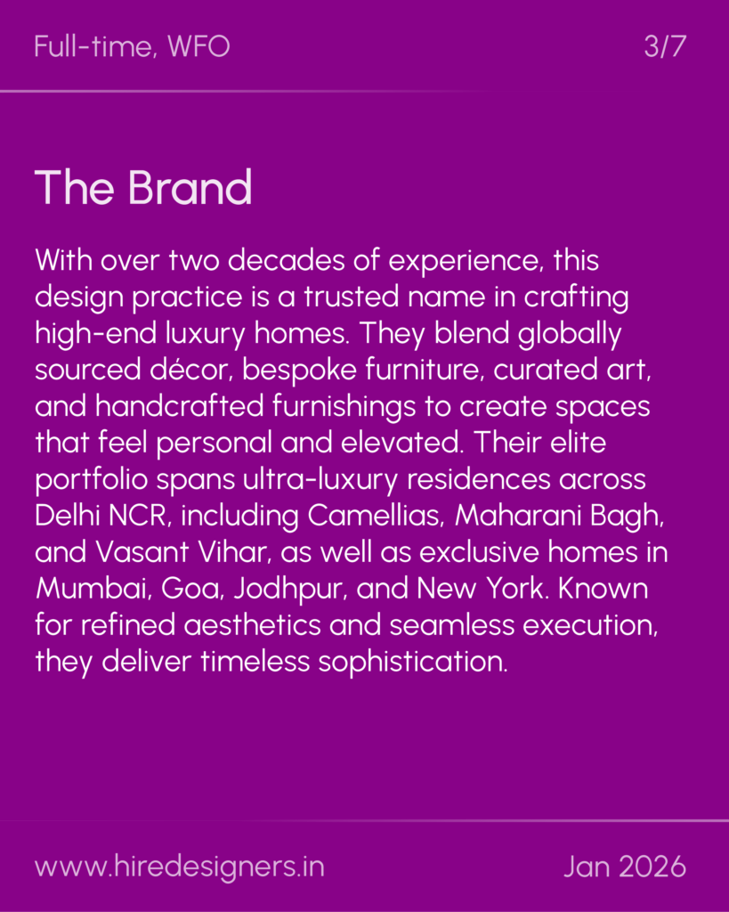 The role involves supporting the complete design process from concept creation to on site coordination, while maintaining quality and timely project delivery. The designer should collaborate closely with the senior team, vendors and artisans for smooth workflow.