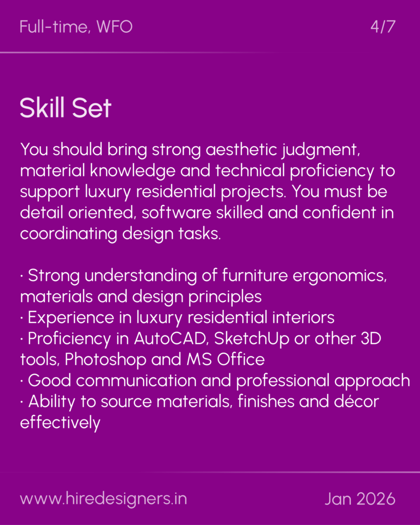You should bring strong aesthetic judgment, material knowledge and technical proficiency to support luxury residential projects. You must be detail oriented, software skilled and confident in coordinating design tasks.