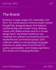 A furniture designer with a strong balance of creativity and technical precision, capable of translating concepts into functional, production-ready designs. The role demands material sensitivity, problem-solving ability, and a refined design sensibility aligned with contemporary aesthetics.