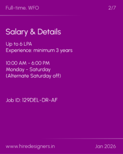 Monday to Saturday(Alternate Saturday Off)(10:00 AM – 6:00 PM)(Flexible)