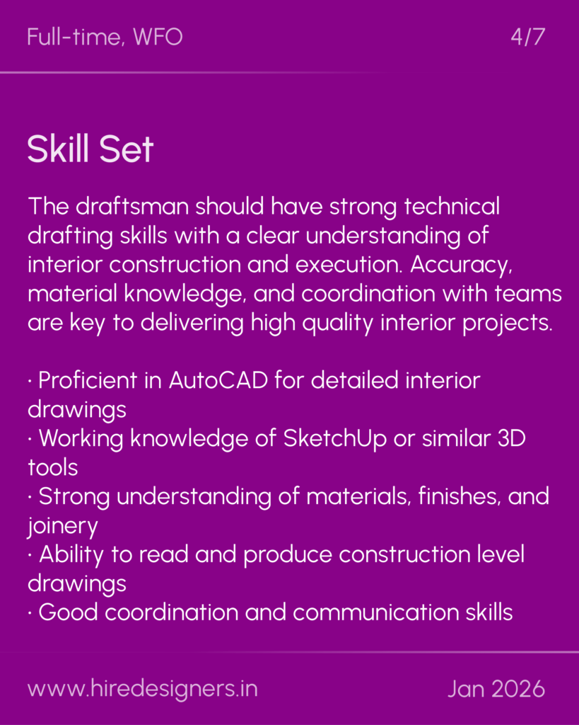 The draftsman should have strong technical drafting skills with a clear understanding of interior construction and execution. Accuracy, material knowledge, and coordination with teams are key to delivering high quality interior projects.