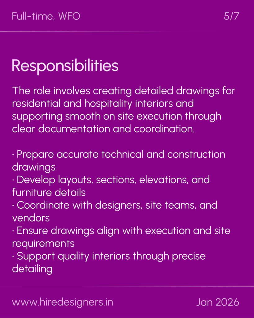 The role involves creating detailed drawings for residential and hospitality interiors and supporting smooth on site execution through clear documentation and coordination.
