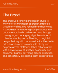 This creative branding and design studio is known for its minimalist approach, strategic visual storytelling, and refined brand identities. It specializes in translating complex ideas into clear, memorable brand expressions through naming, logos, packaging, digital assets, and cohesive visual systems. Blending thoughtful design thinking with clean aesthetics, the studio helps brands communicate with clarity and purpose across platforms. It has collaborated with a diverse mix of lifestyle, hospitality, and consumer brands, delivering precise execution and consistently exceeding client expectations.