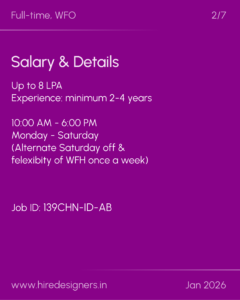Monday to Saturday(Alternate Saturday Off and Flexibility of WFH once a week)(10:00 AM – 6:00 PM)