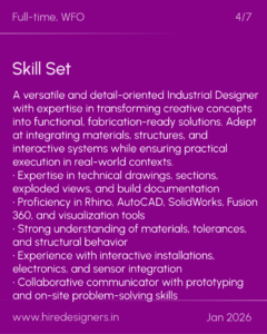 A versatile and detail-oriented Industrial Designer with expertise in transforming creative concepts into functional, fabrication-ready solutions. Adept at integrating materials, structures, and interactive systems while ensuring practical execution in real-world contexts.
