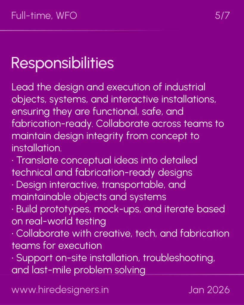 Lead the design and execution of industrial objects, systems, and interactive installations, ensuring they are functional, safe, and fabrication-ready. Collaborate across teams to maintain design integrity from concept to installation.
