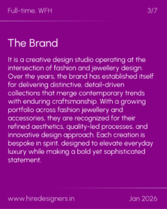A design professional with a sharp eye for fine detail and strong technical command, capable of blending luxury aesthetics with production practicality. The role demands precision, material expertise, and hands-on manufacturing awareness.