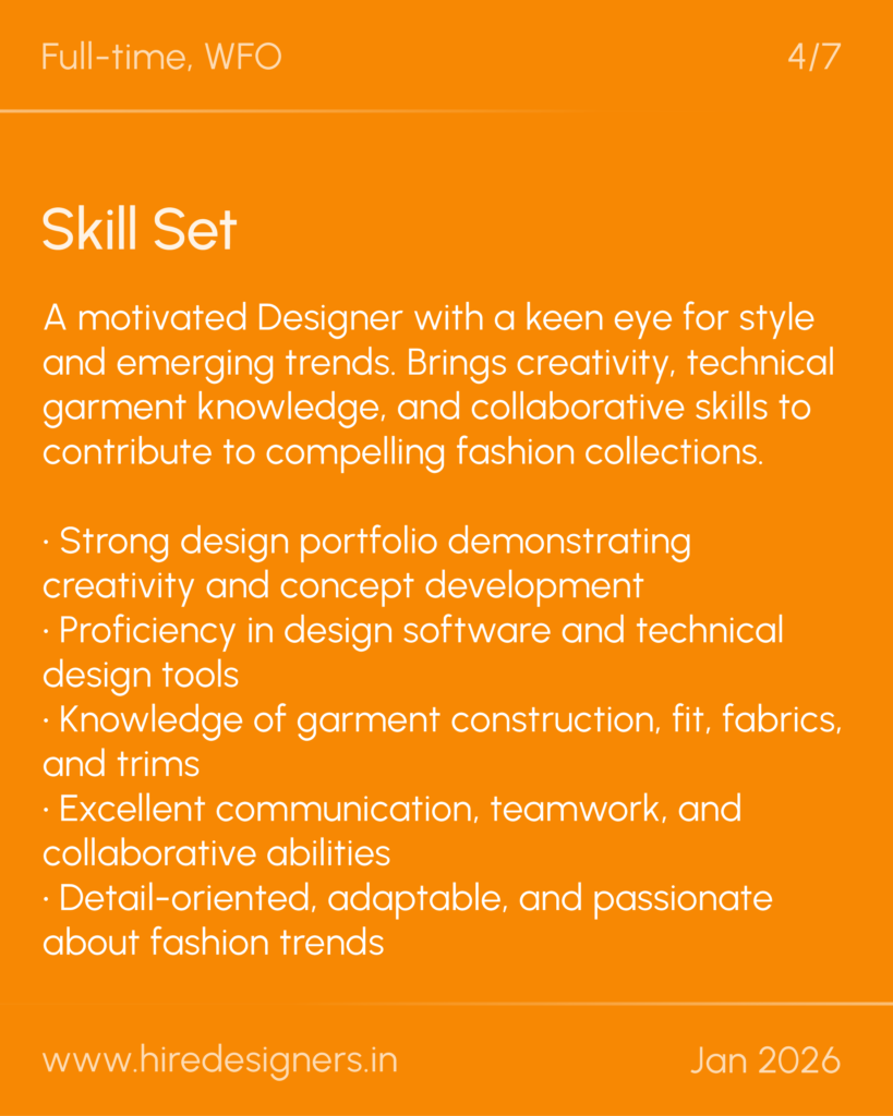 Support the design and development of apparel collections, assisting in translating trends and concepts into production-ready designs. Collaborate with teams to ensure quality and consistency throughout the process.