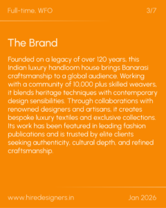 Responsible for leading end-to-end development of luxury handloom collections rooted in Indian textile traditions, from concept to final execution, while working closely with artisans and internal teams.