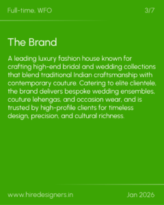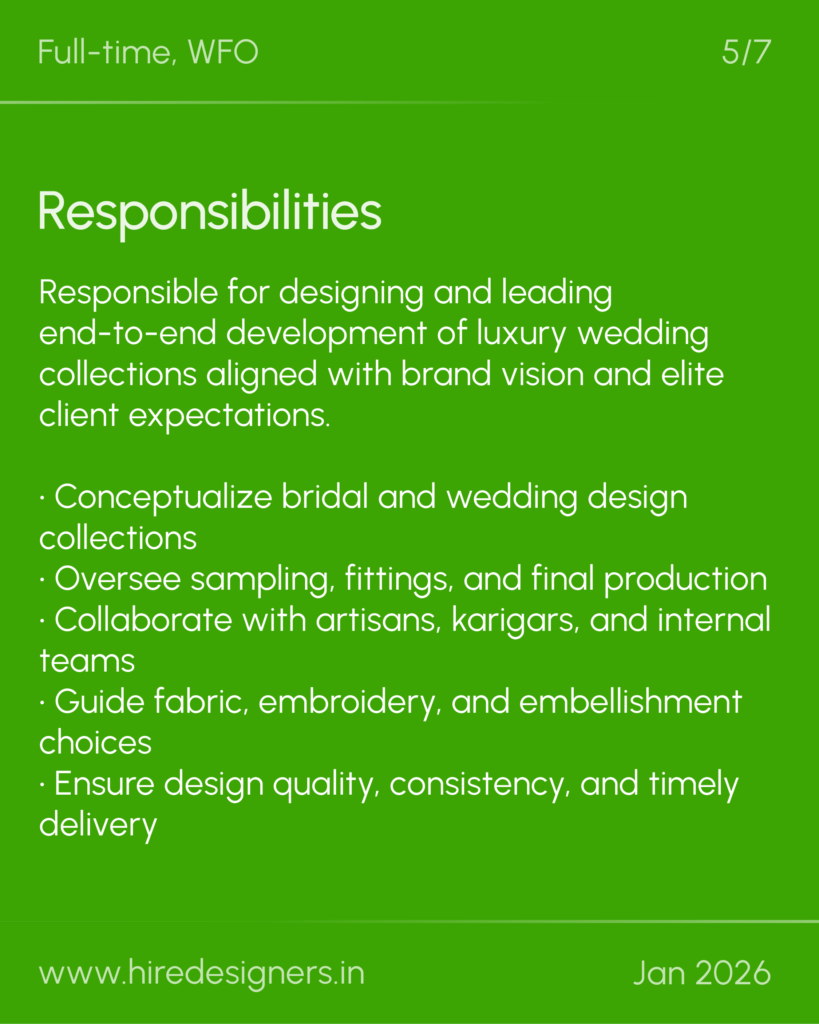 Responsible for designing and leading end-to-end development of luxury wedding collections aligned with brand vision and elite client expectations.