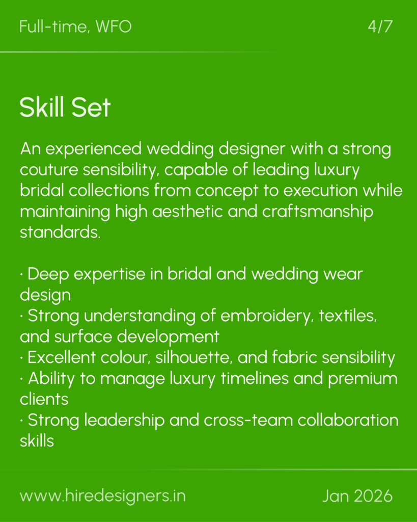 An experienced wedding designer with a strong couture sensibility, capable of leading luxury bridal collections from concept to execution while maintaining high aesthetic and craftsmanship standards.