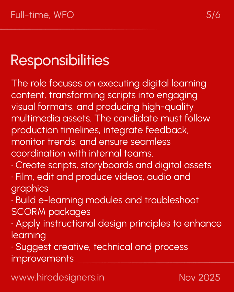 The role focuses on executing digital learning content, transforming scripts into engaging visual formats, and producing high-quality multimedia assets. The candidate must follow production timelines, integrate feedback, monitor trends, and ensure seamless coordination with internal teams.
