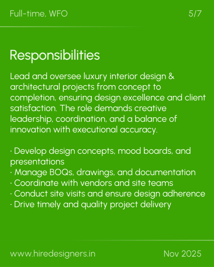 Lead and oversee luxury interior design & architectural projects from concept to completion, ensuring design excellence and client satisfaction. The role demands creative leadership, coordination, and a balance of innovation with executional accuracy.