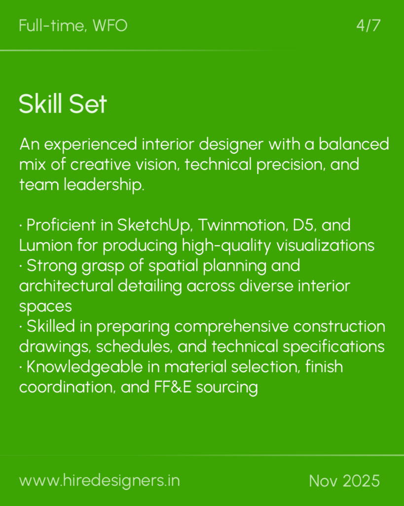 • Strong grasp of spatial planning and architectural detailing across diverse interior spaces