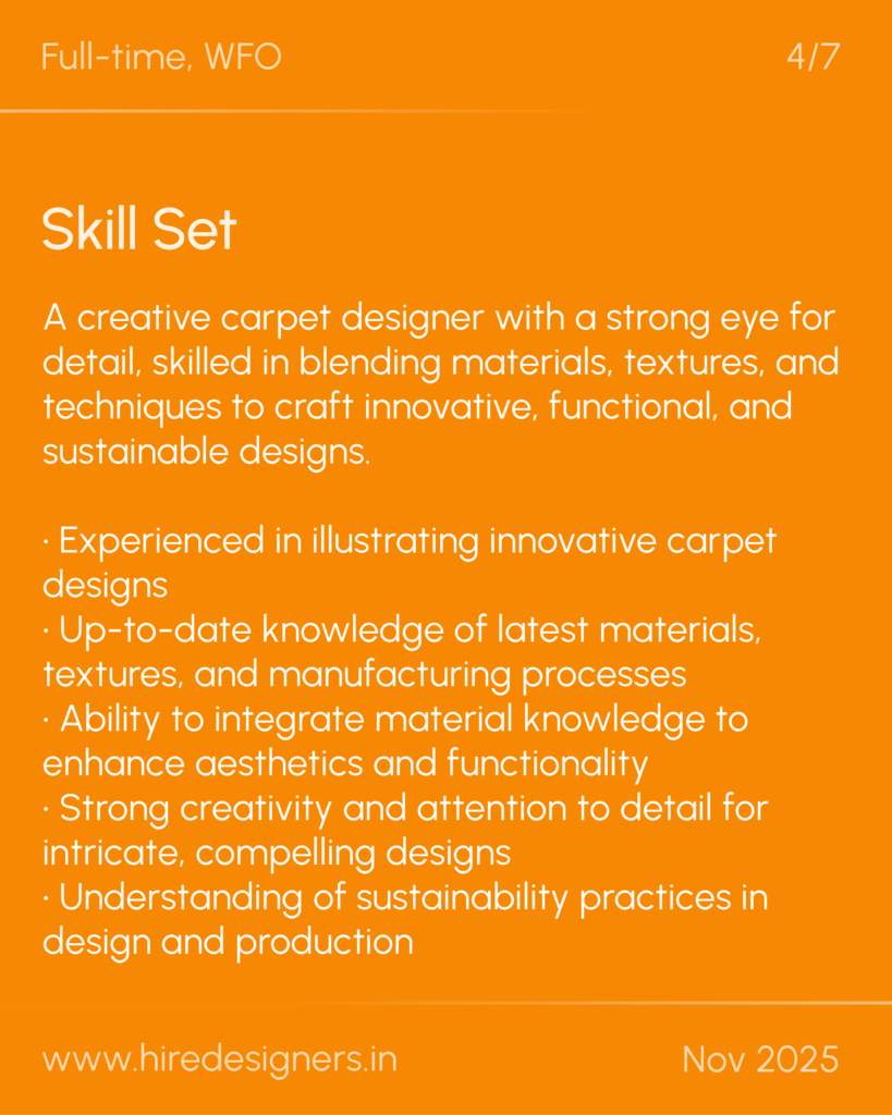 A creative carpet designer with a strong eye for detail, skilled in blending materials, textures, and techniques to craft innovative, functional, and sustainable designs.