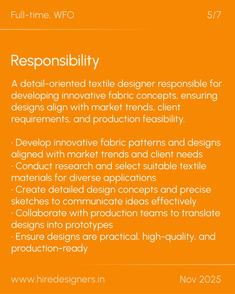 A detail-oriented textile designer responsible for developing innovative fabric concepts, ensuring designs align with market trends, client requirements, and production feasibility.