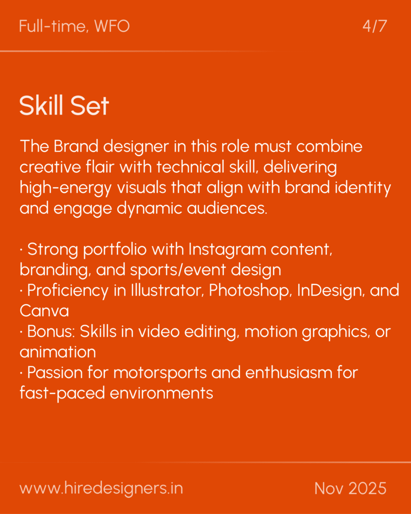 This role calls for end-to-end content creation, brand consistency, and social media management across both karting and racing verticals.