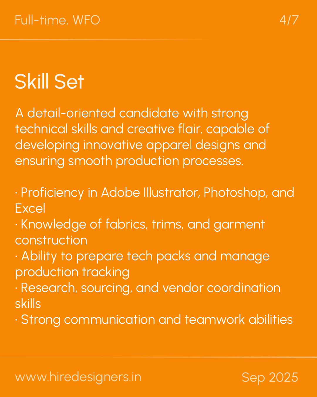 A detail-oriented candidate with strong technical skills and creative flair, capable of developing innovative apparel designs and ensuring smooth production processes.