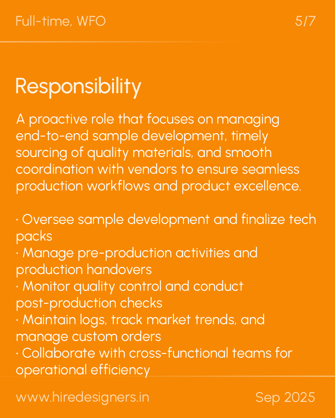A proactive role that focuses on managing end-to-end sample development, timely sourcing of quality materials, and smooth coordination with vendors to ensure seamless production workflows and product excellence.
