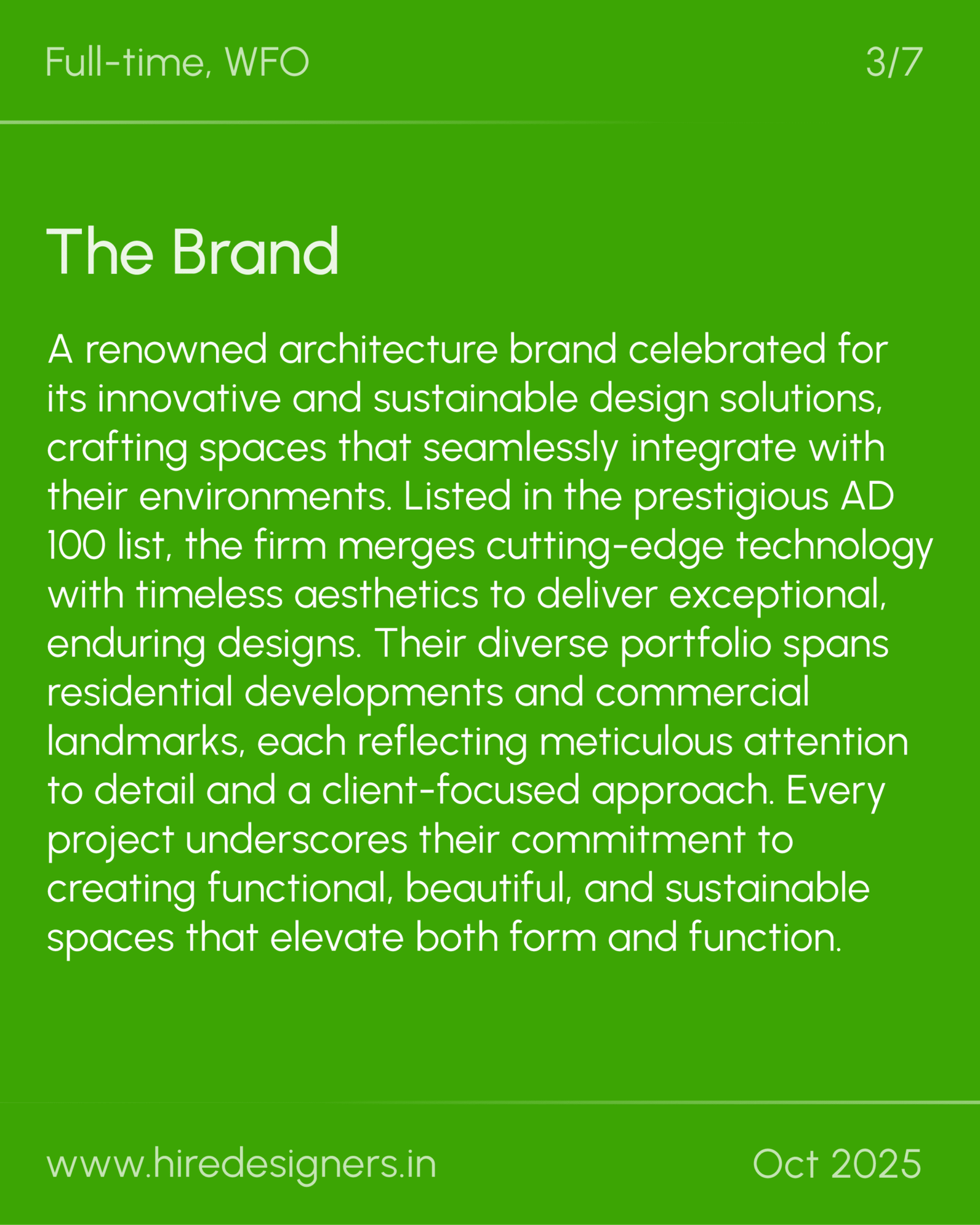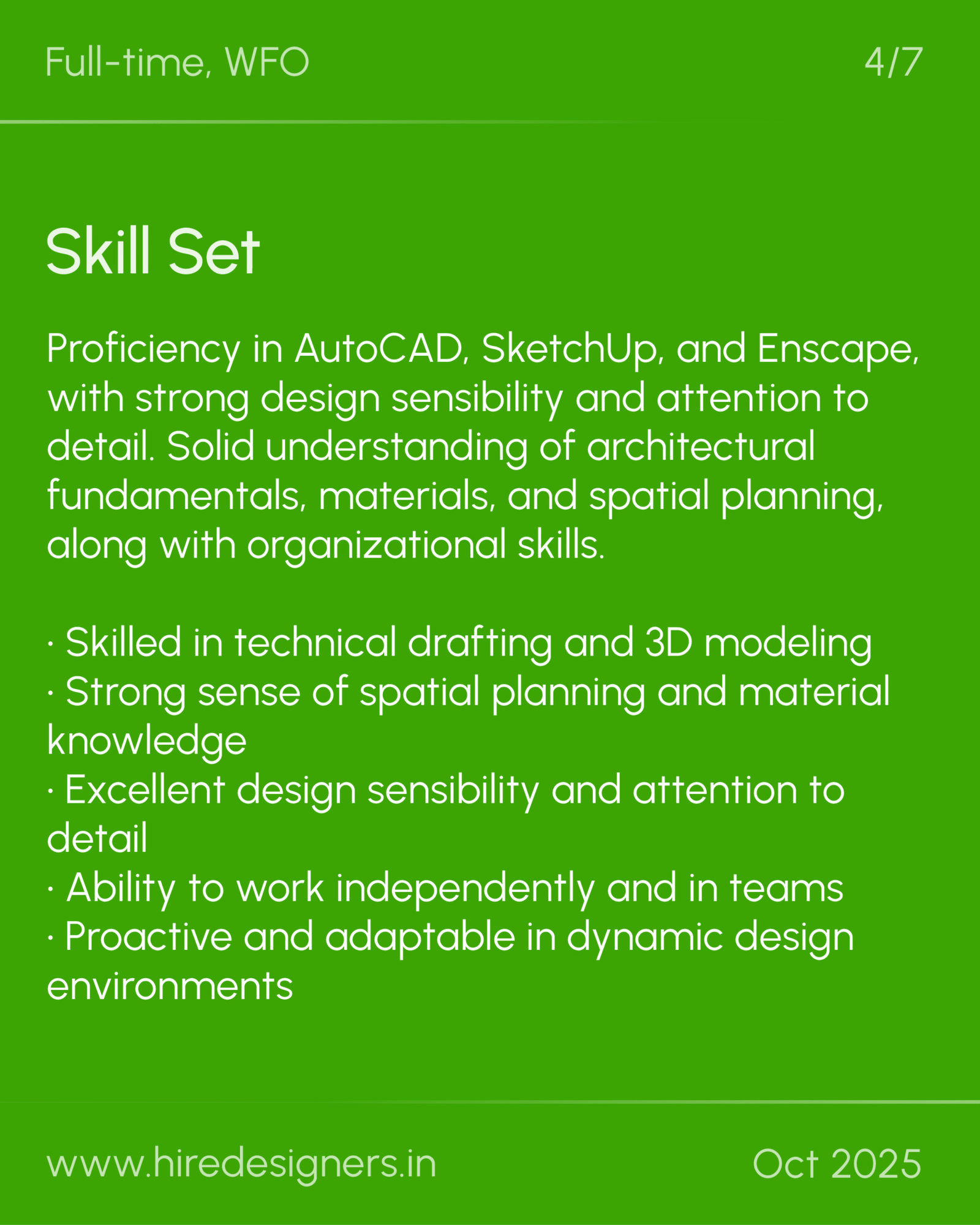 Proficiency in AutoCAD, SketchUp, and Enscape, with strong design sensibility and attention to detail. Solid understanding of architectural fundamentals, materials, and spatial planning, along with organizational skills.