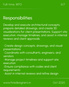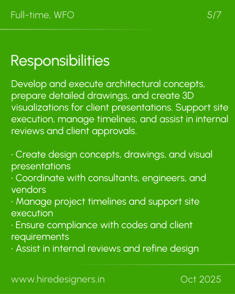 Develop and execute architectural concepts, prepare detailed drawings, and create 3D visualizations for client presentations. Support site execution, manage timelines, and assist in internal reviews and client approvals.
