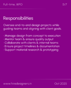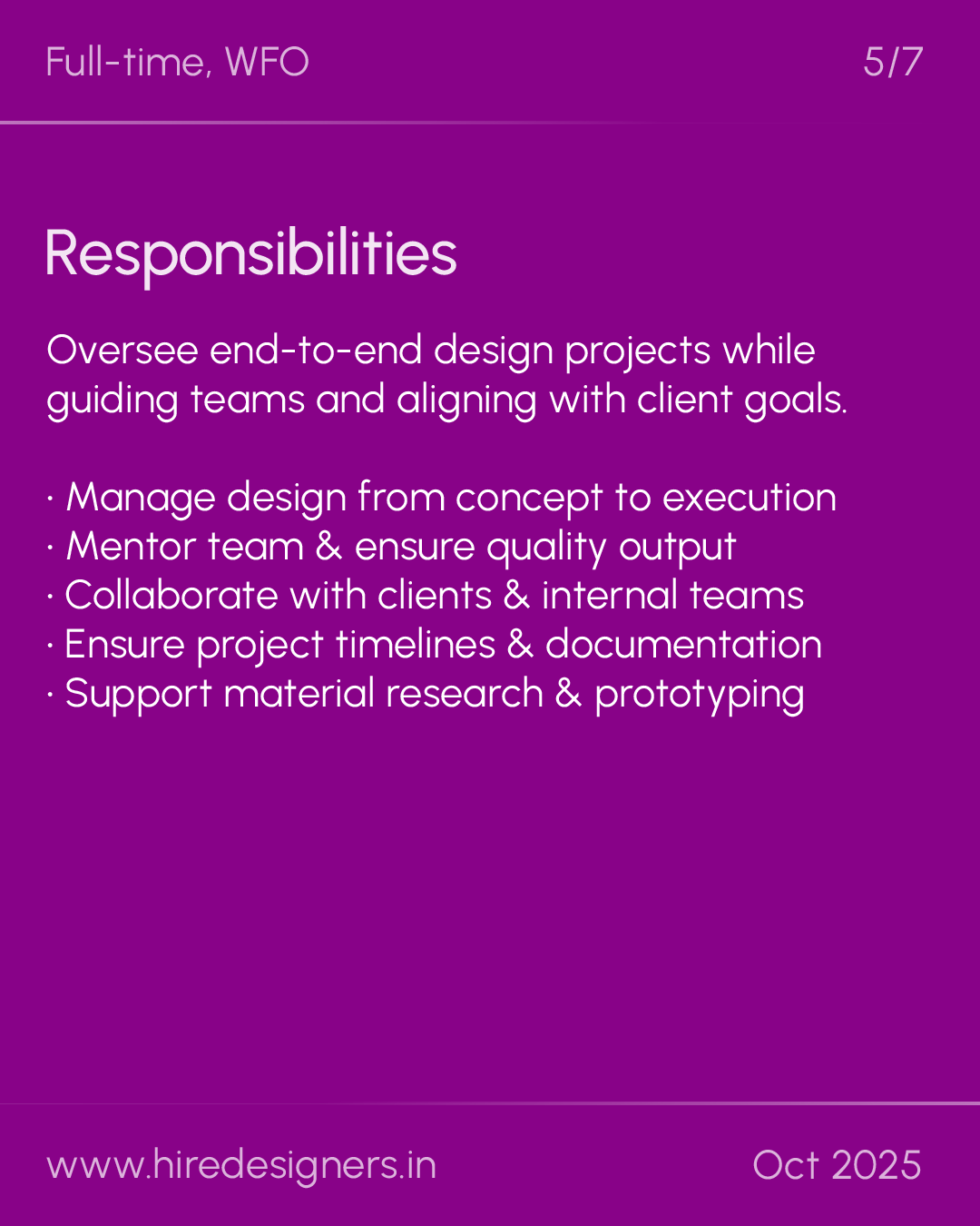 Oversee end-to-end design projects while guiding teams and aligning with client goals.