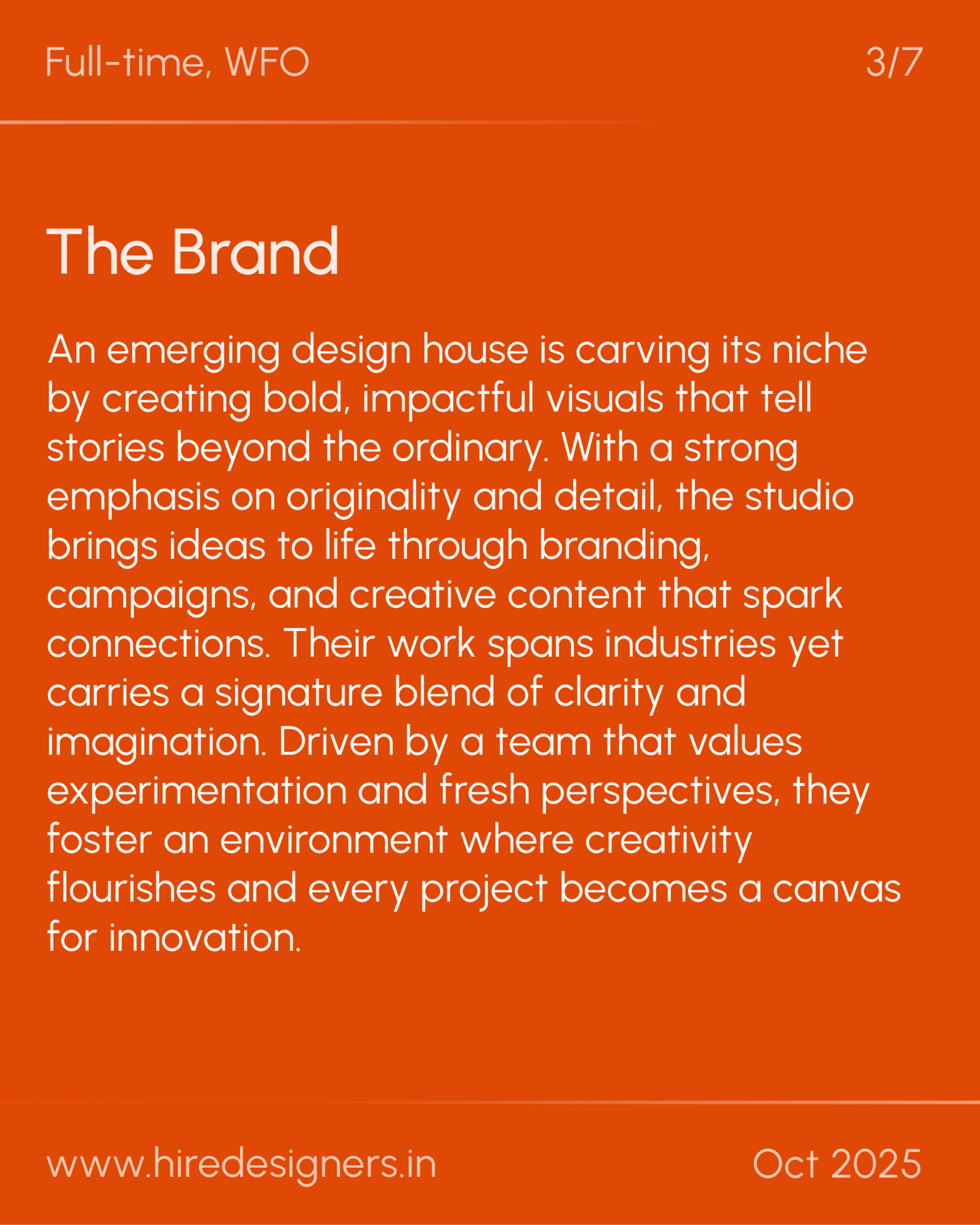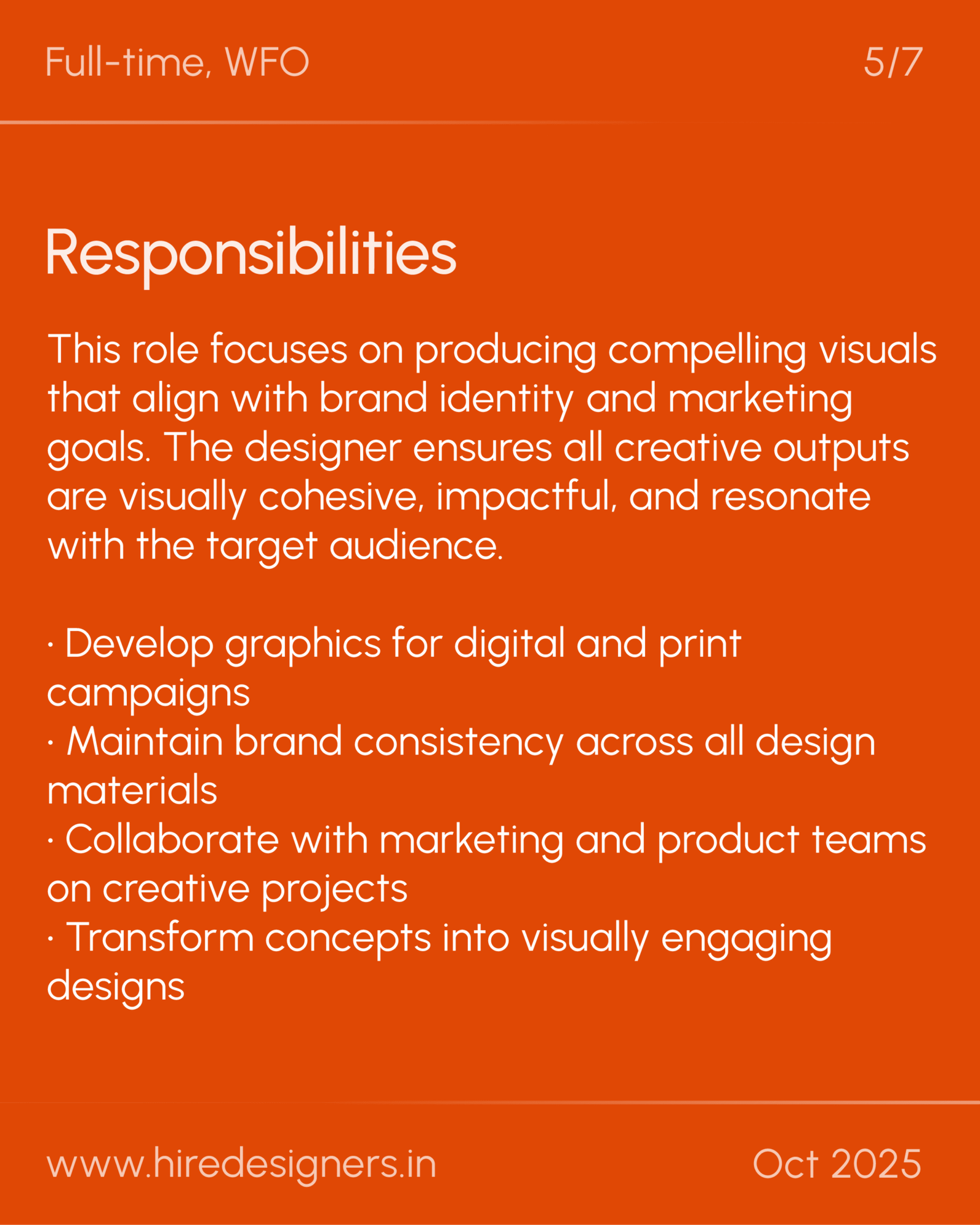 This role focuses on producing compelling visuals that align with brand identity and marketing goals. The designer ensures all creative outputs are visually cohesive, impactful, and resonate with the target audience.