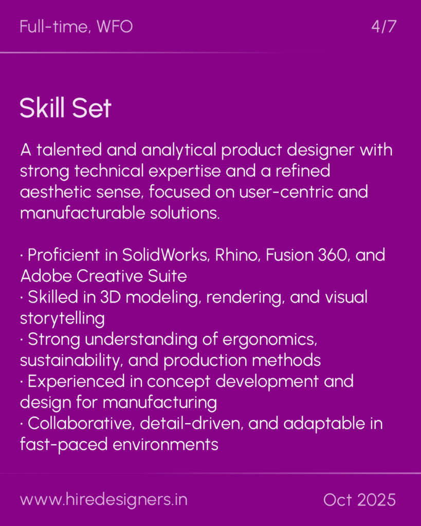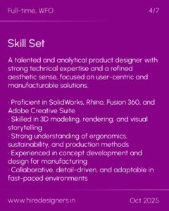 A talented and analytical product designer with strong technical expertise and a refined aesthetic sense, focused on user-centric and manufacturable solutions.