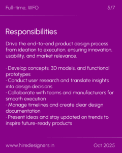 Drive the end-to-end product design process from ideation to execution, ensuring innovation, usability, and market relevance.