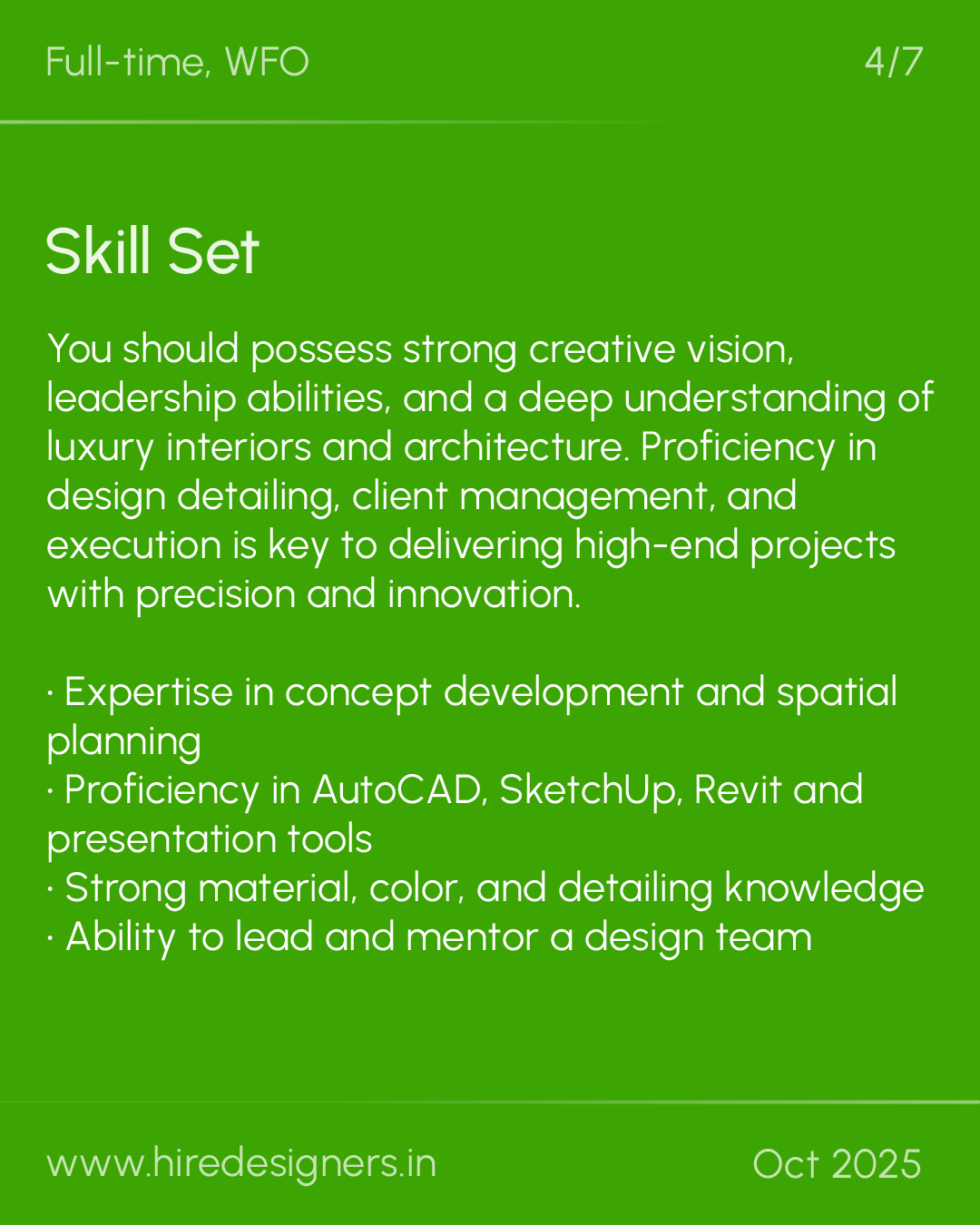 You should possess strong creative vision, leadership abilities, and a deep understanding of luxury interiors and architecture. Proficiency in design detailing, client management, and execution is key to delivering high-end projects with precision and innovation.