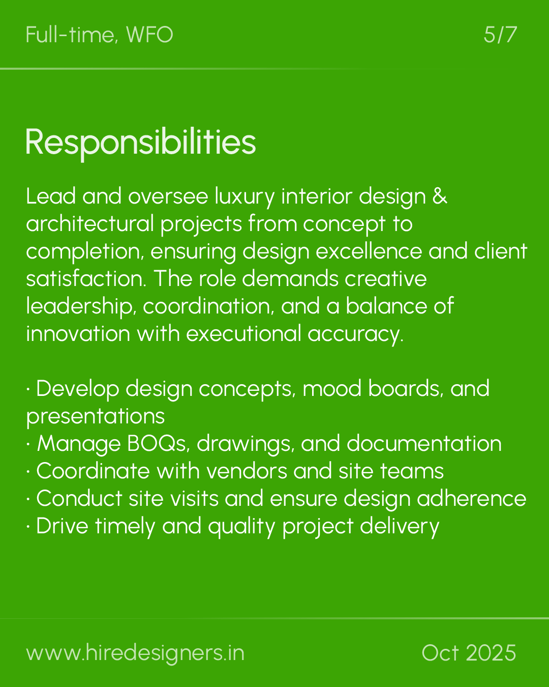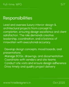 Lead and oversee luxury interior design & architectural projects from concept to completion, ensuring design excellence and client satisfaction. The role demands creative leadership, coordination, and a balance of innovation with executional accuracy.